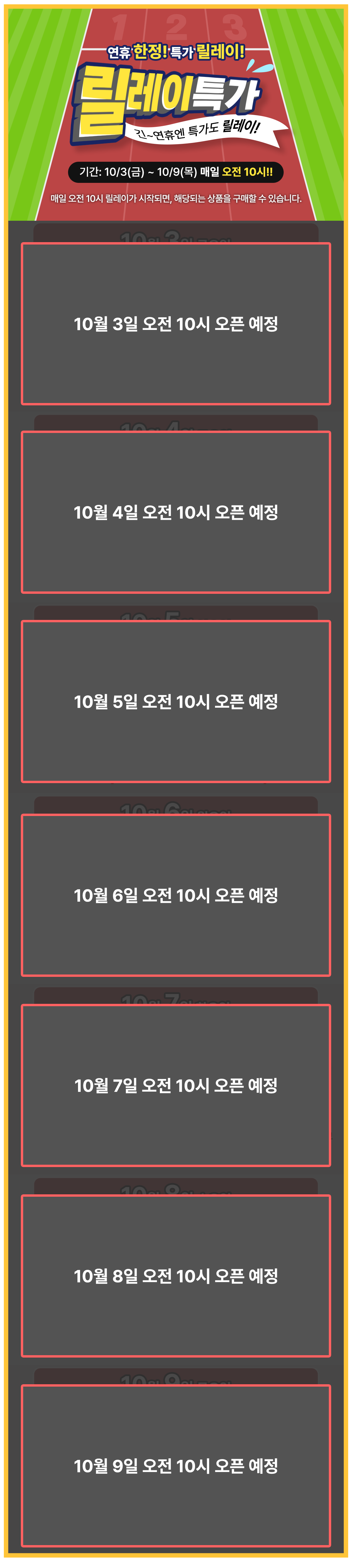 안녕하세요, 주식회사 핌아시아입니다.추석 연휴 한정, 떠리몰 '릴레이특가'가 돌아왔습니다!10월 3일(금) ~ 10월 9일(목) 단 7일간!매일 2개 상품만 초특가로 공개됩니다.평소보다도 더 파격적인 가격으로 만나는 1일 한정특가!이번 기회를 절대 놓치지 마세요.